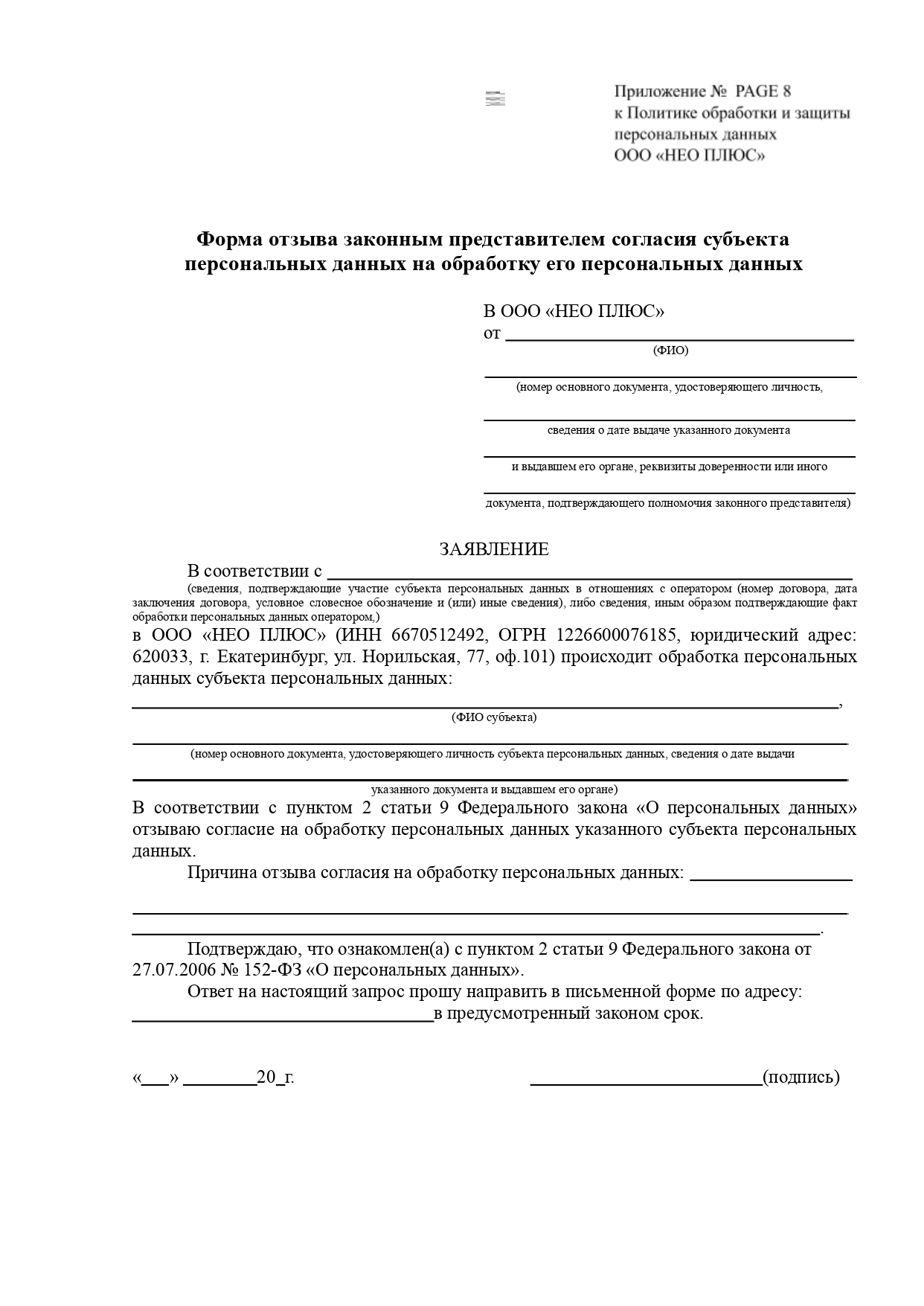6.11. Для отзыва согласия Субъекта персональных данных на обработку его персональных данных субъекту (либо законному представителю) необходимо заполнить соответствующую форму отзыва согласия субъекта персональных данных на обработку его персональных данных (приложение 4 или 8) и передать лично работникам ООО «НЕО ПЛЮС», принимающим обращения граждан, либо по почте. В случае отзыва согласия на обработку персональных данных ООО «НЕО ПЛЮС» вправе продолжить обработку персональных данных без согласия субъекта персональных данных при наличии оснований, указанных в пунктах 2 - 11 части 1 статьи 6, части 2 статьи 10 и части 2 статьи 11 Федерального закона от 27.07.2006 № 152-ФЗ «О персональных данных».